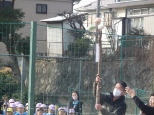長い竹の棒の先端につけたお団子を火にあぶりながら、